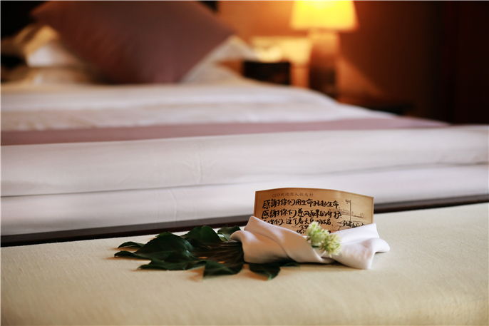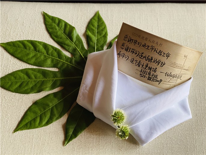 “為了向最美‘逆行者’致敬,我們工作人員用口布疊成護(hù)士服,手寫(xiě)了歡迎信放在房間,在磨坊書(shū)吧門(mén)口烏村專(zhuān)門(mén)打造了致敬白衣天使的打卡點(diǎn)?!?br/>