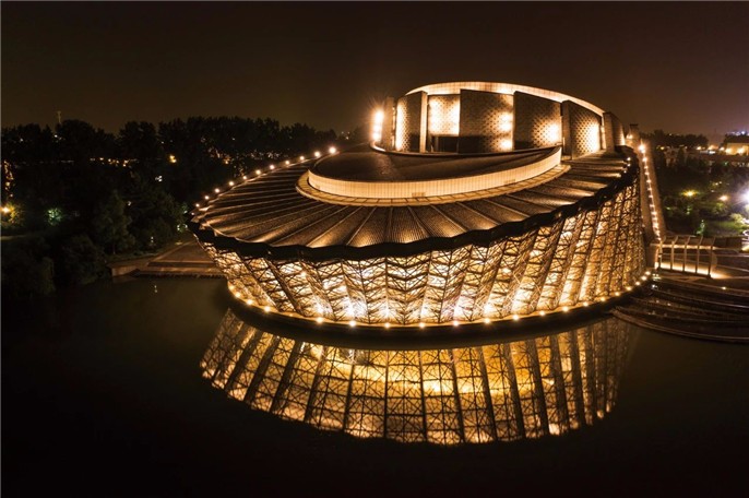 說(shuō)烏鎮(zhèn)大劇院是“中國(guó)最美麗的劇院”之一不為過(guò)。劇院外部以厚重青磚及江南冰裂窗欞裝飾,古樸卻又當(dāng)代。亮燈之后,仿佛生出兩個(gè)烏鎮(zhèn)大劇院,一個(gè)自水中升起,另一個(gè)則倒影在碧水中。虛實(shí)相間,如戲劇一般如夢(mèng)似幻,所有旅人都會(huì)被它的空靈所打動(dòng)。