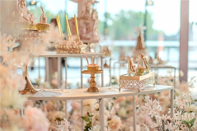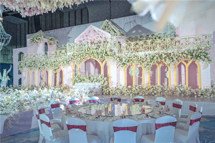 大多數(shù)宴會廳可以依據(jù)新人的需求布置成不同風格、不同樣式的主題婚禮廳堂,如新中式、奢華水鄉(xiāng)婚禮等盡在帷幄。