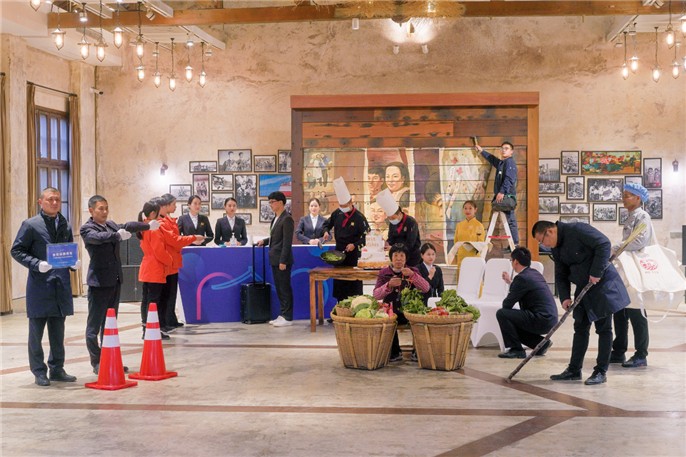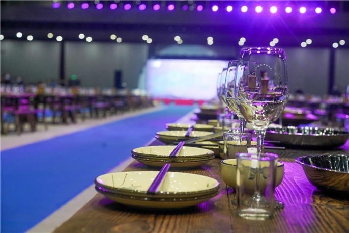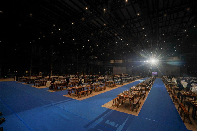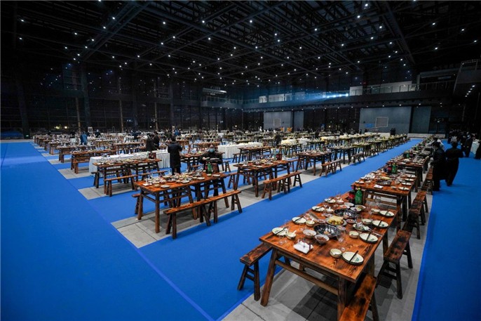 適逢下雨,會議團(tuán)原計(jì)劃的古鎮(zhèn)長街宴調(diào)整在烏鎮(zhèn)互聯(lián)網(wǎng)國際會展中心進(jìn)行,烏旅人冒雨將200余方桌齊刷刷搬遷到了會展中心,以木桌相連的方式呈現(xiàn)了別樣的“長街宴”。
