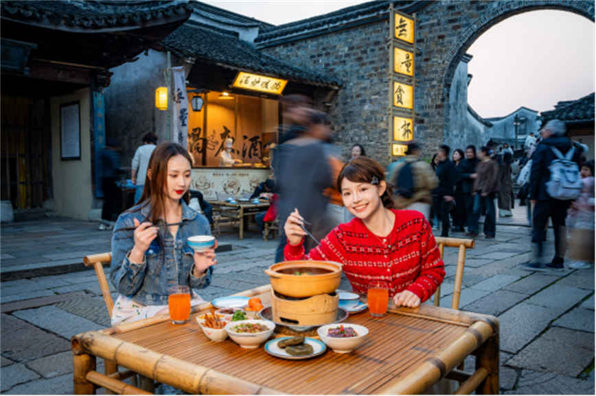 今年烏鎮(zhèn)還特別推出龍舟船宴,帶來水鄉(xiāng)食五黃的新場景和新體驗:8艘搖櫓船首尾相連,化作“水上巨龍”。游客們可在靈水居碼頭登船,沿著精心設計的巡游路線,享沉浸式宴飲。用餐儀式更是別具一格,NPC敲鑼開宴,搭配畫額、佩戴五彩繩、沐蘭湯等傳統(tǒng)習俗,讓每一口美食都承載著深厚的文化底蘊。