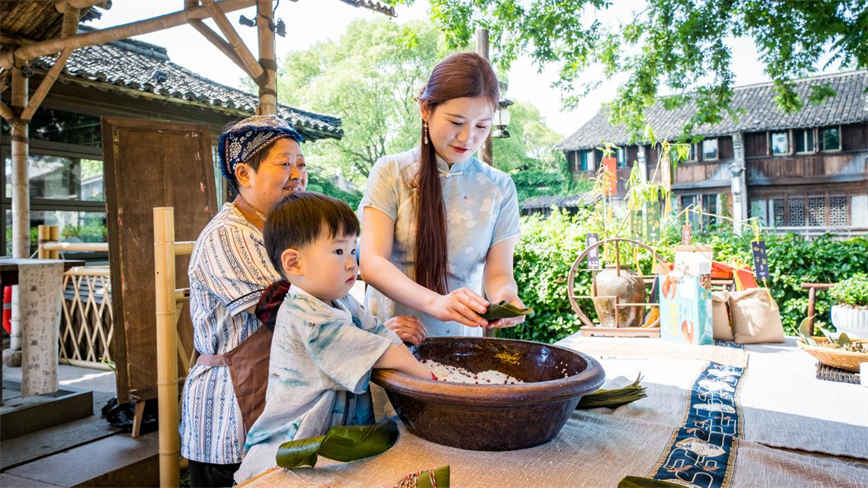 烏鎮(zhèn)以沉浸式體驗活化端午傳統(tǒng)。靈水居草坪上,民俗游園會以集章形式串聯(lián)節(jié)俗體驗——游客可自由選擇包粽子、斗草、射五毒、祈福等互動項目,集齊五枚印章即可參與抽獎,贏取定制端午禮盒、明信片等限定好禮。其中,包粽子區(qū)域特設“粽香傳情”環(huán)節(jié),游客可手寫心愿書簽,以紙為舟,傳遞來自世界各地游客素未謀面的端午祝福。