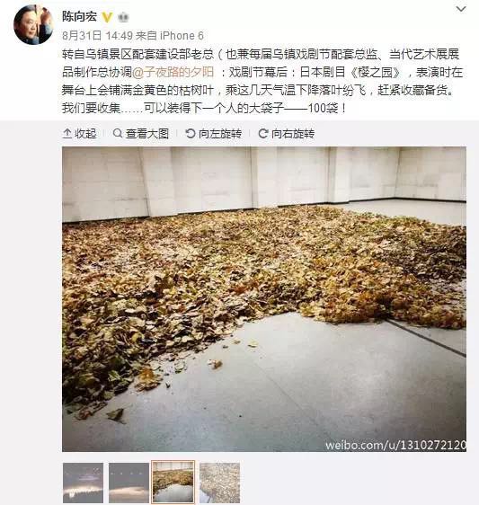 劇目《櫻之園》在室外劇場(chǎng)詩(shī)田廣場(chǎng)演出,應(yīng)劇組的要求,要準(zhǔn)備125L*100袋的落葉,這讓技術(shù)組的金工愁掉了不少頭發(fā),籌備時(shí),天氣未涼,樹(shù)葉未黃,金工甚至準(zhǔn)備出到5萬(wàn)的高價(jià)去北方買(mǎi)落葉。還好,前幾日的大風(fēng)解決了他的煩惱,一夜秋風(fēng)起,滿景區(qū)的清掃員,一點(diǎn)點(diǎn)的收集起落葉,堆進(jìn)了倉(cāng)庫(kù),為了怕落葉受潮,技術(shù)組還在倉(cāng)庫(kù)開(kāi)抽濕機(jī),每天都去翻動(dòng)一下。
