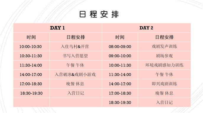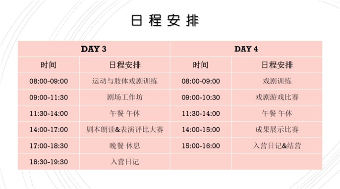 這里有一份戲劇夏令營的Schedule, 請各位小朋友的“經(jīng)紀(jì)人”注意查收