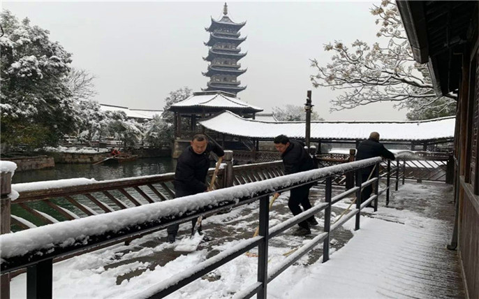為保障游客安全游覽,避免因積雪路面較滑導(dǎo)致游客受傷等安全事件的發(fā)生,公司員工第一時(shí)間自發(fā)地進(jìn)行了積雪清理。
