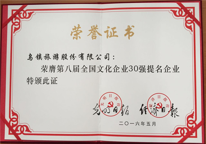 5月12日,烏鎮(zhèn)旅業(yè)在中宣部召開的“以新發(fā)展理念引領(lǐng)文化改革發(fā)展”座談會(huì)上,榮獲“第八屆中國文化企業(yè)30強(qiáng)提名企業(yè)”,烏鎮(zhèn)旅游股份有限公司總裁陳向宏出席座談并現(xiàn)場領(lǐng)獎(jiǎng)。