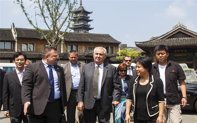 2015年9月6日,前往北京參加“中國人民抗日戰(zhàn)爭暨反法西斯戰(zhàn)爭勝利70周年”閱兵儀式的捷克總統(tǒng)米洛什·澤曼及夫人依瓦娜·澤曼諾娃,來到烏鎮(zhèn)西柵景區(qū)參觀訪問。