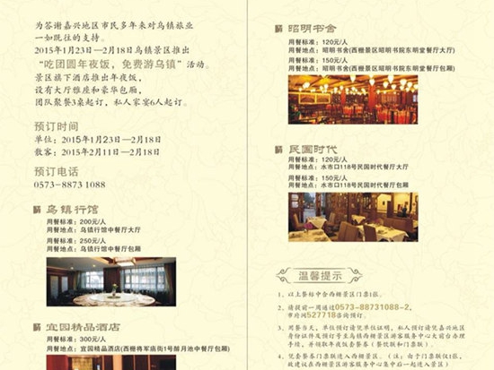 預(yù)訂團(tuán)圓年夜飯,免費(fèi)暢游烏鎮(zhèn)西柵。