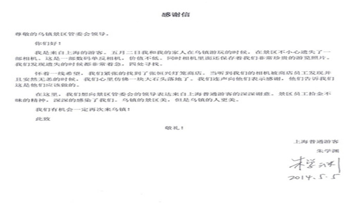近日,烏鎮(zhèn)景區(qū)收到了一封感謝信,這封感謝信表達(dá)了游客朱學(xué)淵對(duì)張恒興花燈鋪員工的感激之情!