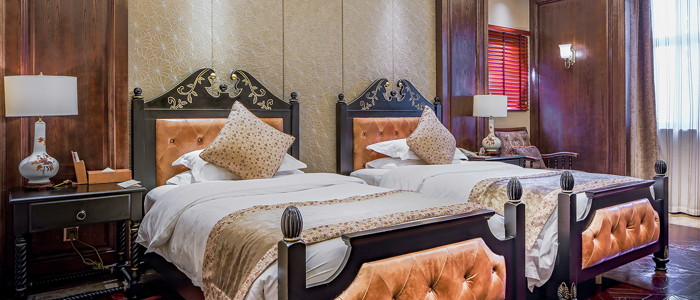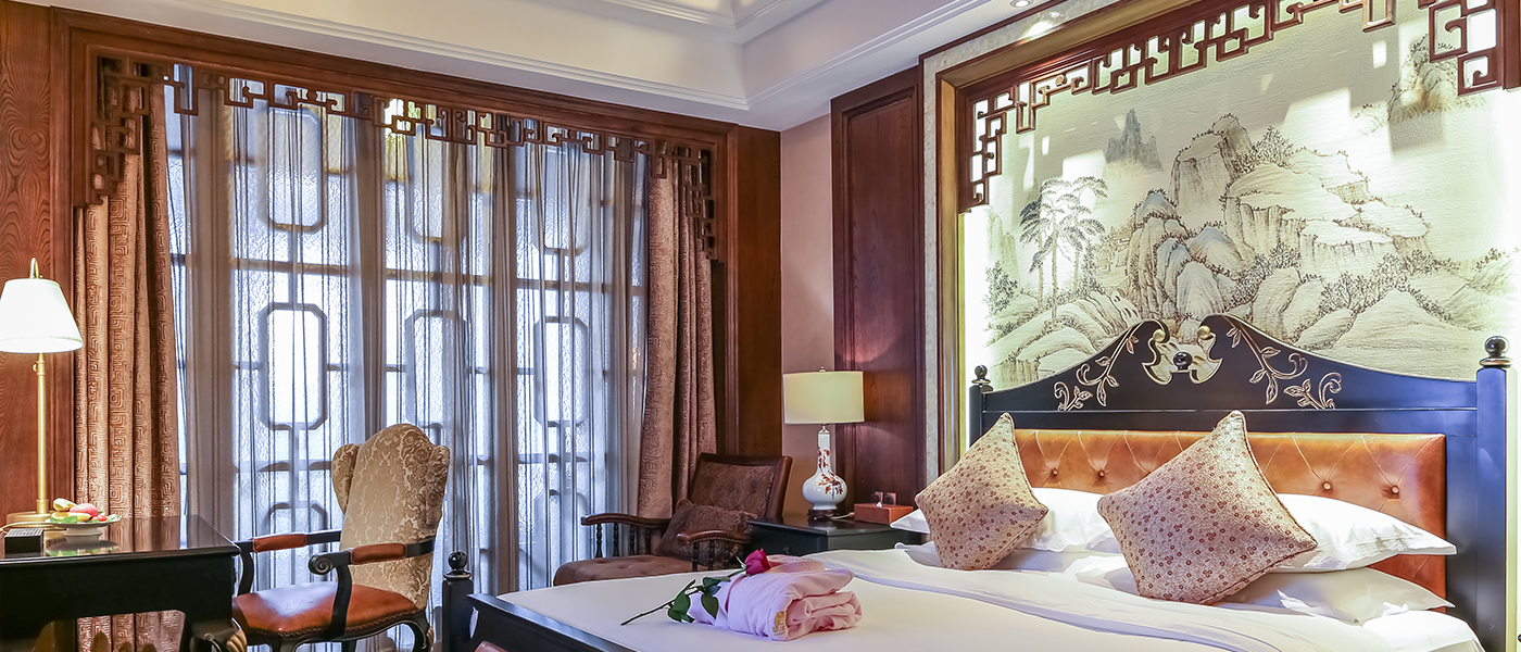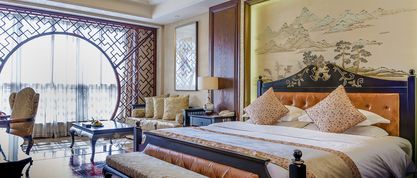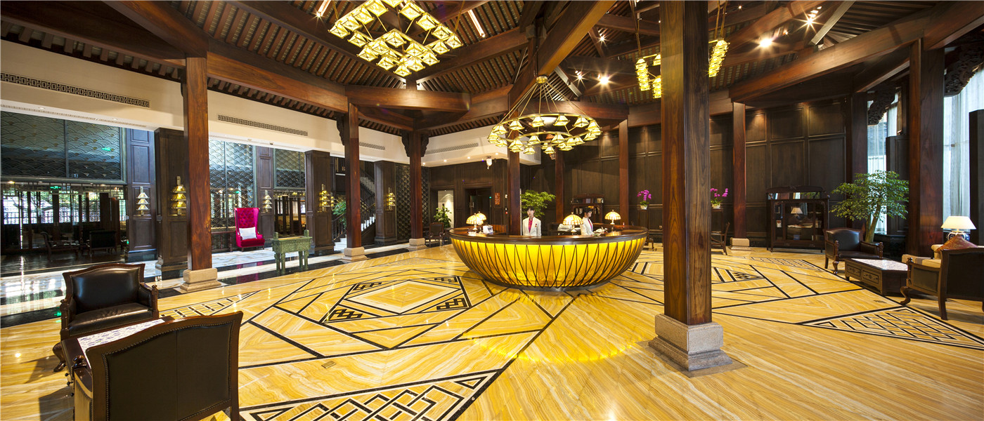 南臨翡翠漾,背靠古老的京杭運河。酒店大堂采用中國傳統(tǒng)的“雙亭式”建筑結構,大堂整體構造木料、立柱、大梁均采用上等珍貴紅木,榫卯環(huán)扣,斗形天穹,為國內(nèi)罕見的“紅木大堂”